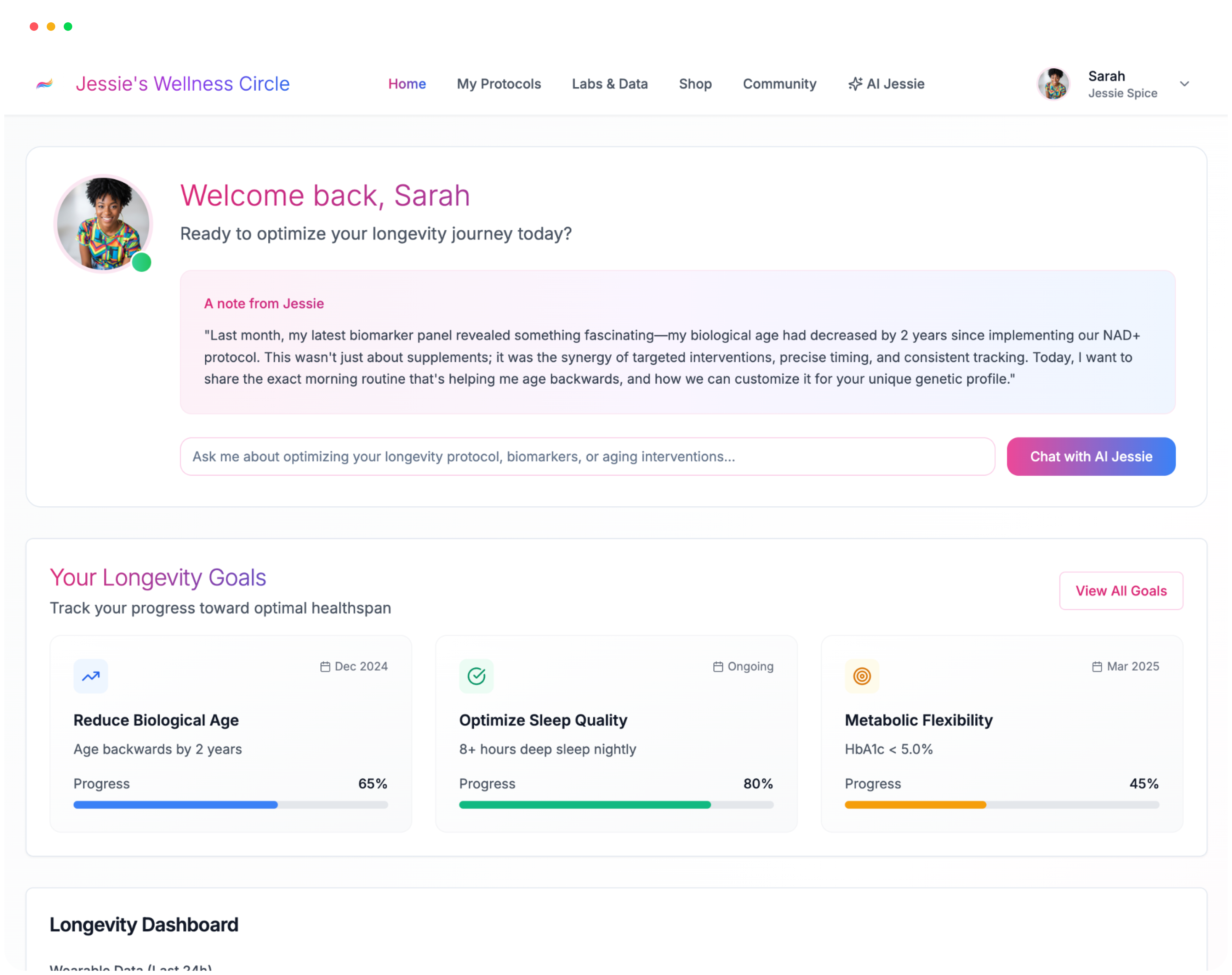 Your clients will experience - a personalized healthspace dashboard with your branding, AI coaching, biomarker tracking, and comprehensive