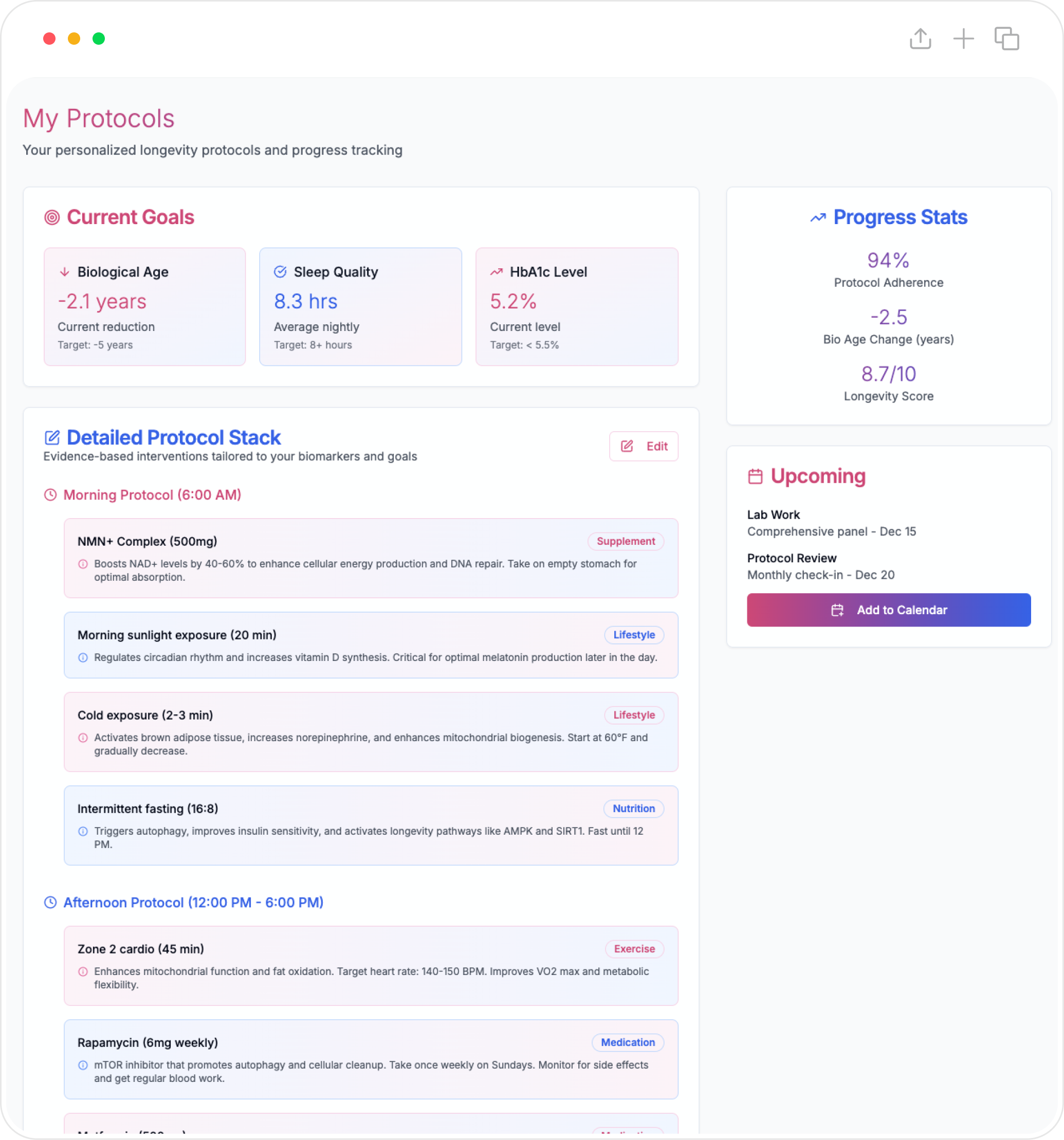 Comprehensive biomarker testing and AI analysis reveal your client's precise biological age, inflammation levels, hormonal balance, and nutrient status—forming the foundation of their personalized plan.